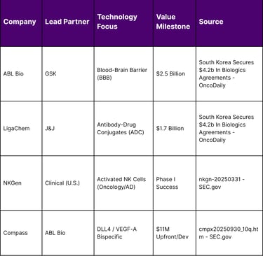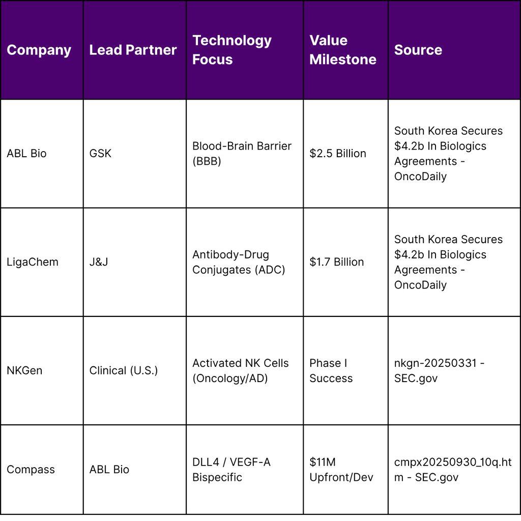 Key partnerships in this sector highlight the technical depth of South Korean assets. GlaxoSmithKline’s (GSK) $2.5 billion agreement with ABL Bio is a prime example, targeting neurodegenerative diseases through a platform designed to transport therapeutic antibodies across the BBB. Similarly, LigaChem Biosciences’ $1.7 billion partnership with Johnson & Johnson (J&J) underscores the value of South Korean ADC technology in global oncology pipelines.